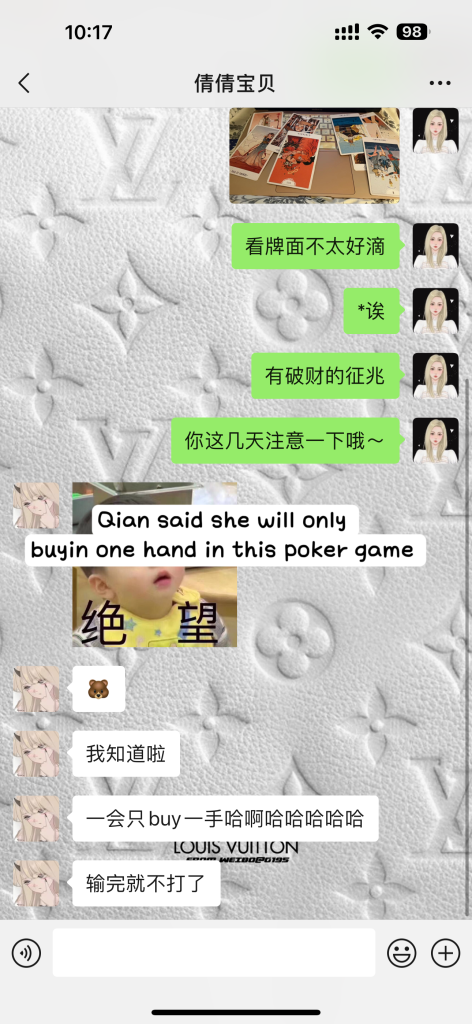 1. The “Lucky” Group: Those who were given items or told they were lucky (Woyuan, Alice, and Jianing) exhibited more aggressive play. They were more likely to believe in luck, trust the outs will come and follow the river. and even place higher bets.